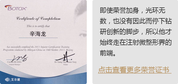 辛海龙主任,从事微整形15年之久,临床经验丰富,采用Air安全注射技术和良好的审美观,塑造出自然和谐之美。